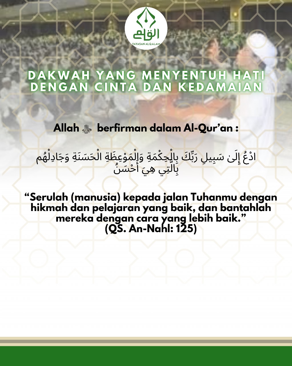“Serulah (manusia) kepada jalan Tuhanmu dengan hikmah dan pelajaran yang baik, dan bantahlah mereka dengan cara yang lebih baik.”