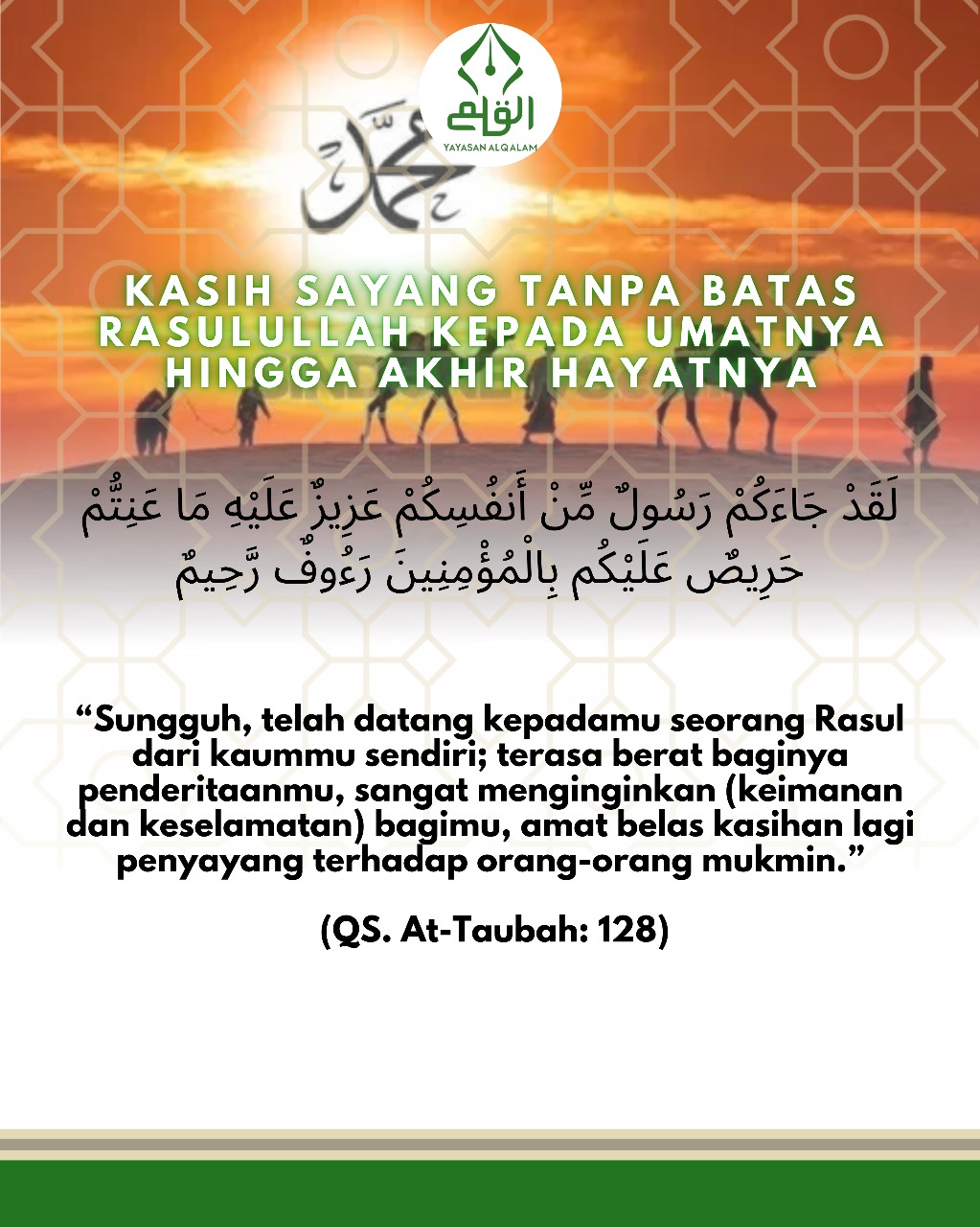 “Sungguh, telah datang kepadamu seorang Rasul dari kaummu sendiri; terasa berat baginya penderitaanmu, sangat menginginkan (keimanan dan keselamatan) bagimu, amat belas kasihan lagi penyayang terhadap orang-orang mukmin.”