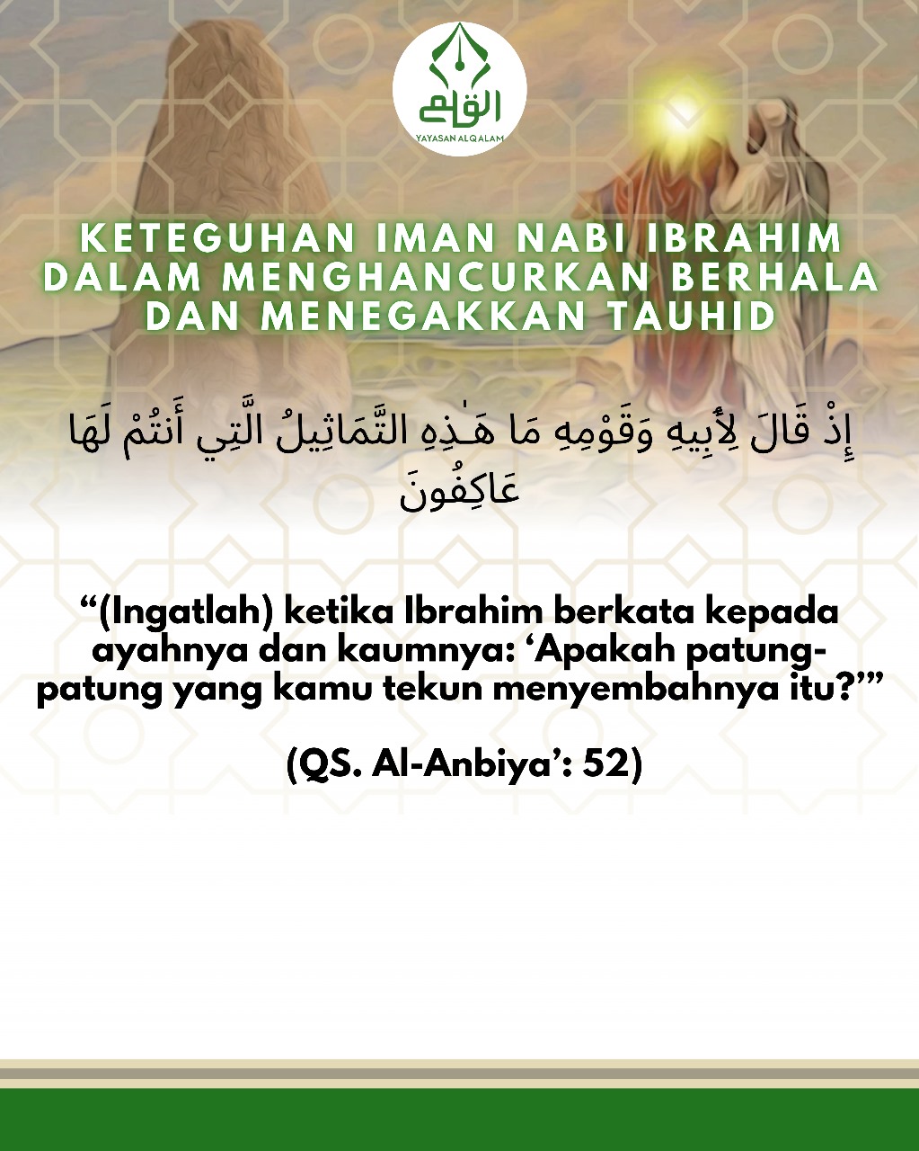 Nabi Ibrahim hidup di tengah masyarakat yang menyembah berhala, bahkan ayahnya sendiri, Azar, adalah pembuat patung. Namun, Ibrahim tidak mengikuti tradisi buta itu. Ia justru mempertanyakan keyakinan yang diwariskan tanpa ilmu, dan dengan penuh hikmah mengajak kaumnya untuk menyembah Allah yang Maha Esa.