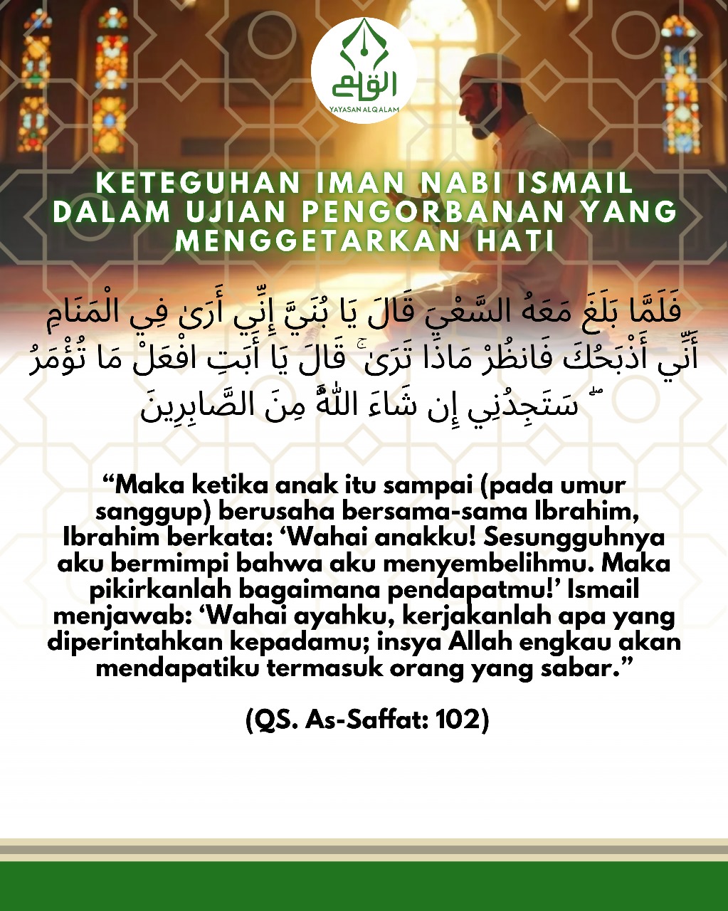 “Maka ketika anak itu sampai (pada umur sanggup) berusaha bersama-sama Ibrahim, Ibrahim berkata: ‘Wahai anakku! Sesungguhnya aku bermimpi bahwa aku menyembelihmu. Maka pikirkanlah bagaimana pendapatmu!’ Ismail menjawab: ‘Wahai ayahku, kerjakanlah apa yang diperintahkan kepadamu; insya Allah engkau akan mendapatiku termasuk orang yang sabar.’”