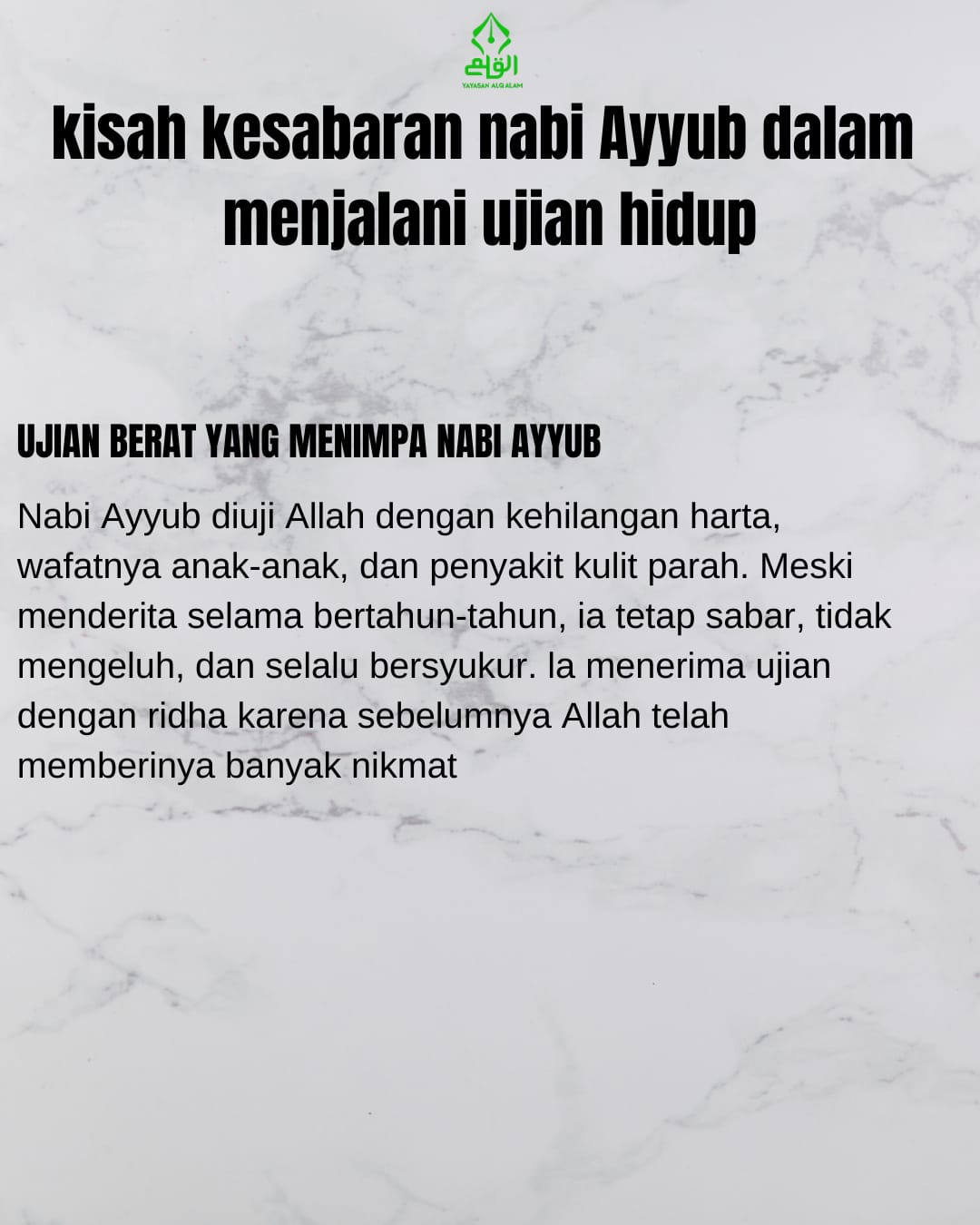 Setiap manusia tentu tidak terlepas dari ujian hidup. Ada yang diuji dengan harta, kesehatan, maupun keluarga. Dalam sejarah para nabi, salah satu teladan agung dalam menghadapi ujian adalah Nabi Ayyub ‘alaihissalam, seorang hamba Allah yang luar biasa sabarnya.