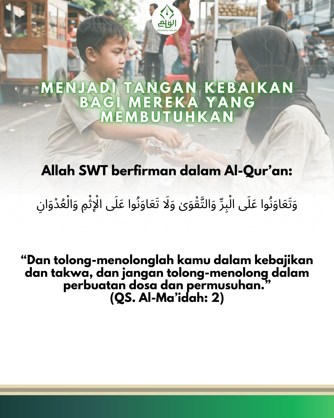 “Dan tolong-menolonglah kamu dalam kebajikan dan takwa, dan jangan tolong-menolong dalam perbuatan dosa dan permusuhan.”