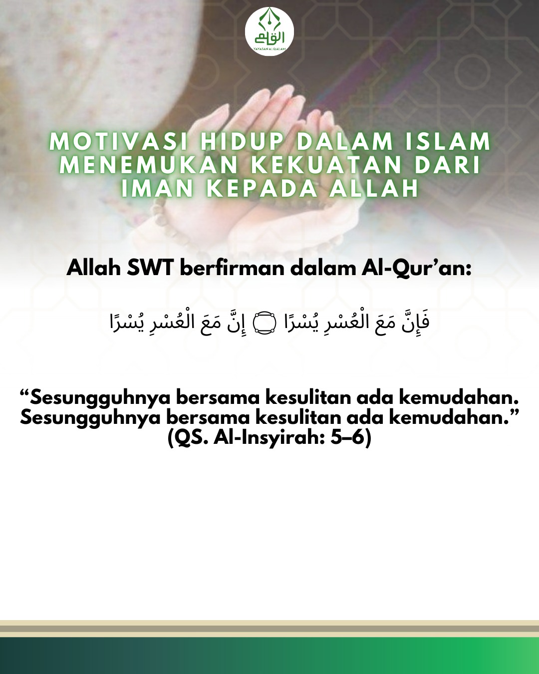 Dalam pandangan Islam, sumber motivasi terbesar adalah iman kepada Allah SWT. Iman membuat seseorang yakin bahwa segala sesuatu yang terjadi dalam hidupnya berada dalam rencana Allah yang penuh hikmah. Ketika iman kuat, seseorang tidak mudah putus asa, karena ia percaya bahwa Allah selalu memberikan yang terbaik bagi hamba-Nya.