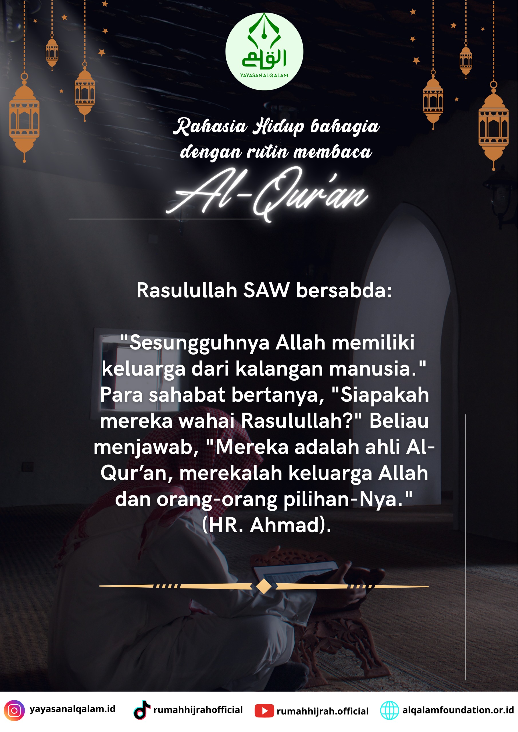 Rasulullah SAW bersabda: “Sesungguhnya Allah memiliki keluarga dari kalangan manusia.” Para sahabat bertanya, “Siapakah mereka wahai Rasulullah?” Beliau menjawab, “Mereka adalah ahli Al-Qur’an, merekalah keluarga Allah dan orang-orang pilihan-Nya.” (HR. Ahmad). Dengan rutin membaca Al-Qur’an, seorang hamba akan mendapatkan keberkahan dalam hidupnya. Rezeki terasa cukup, masalah lebih ringan, dan jalan hidup dimudahkan oleh Allah SWT.
