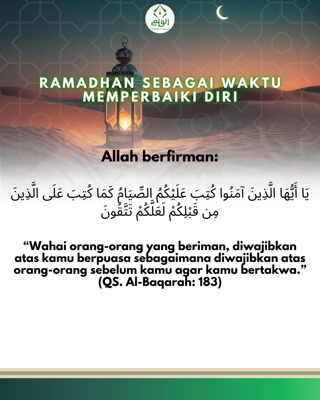 “Wahai orang-orang yang beriman, diwajibkan atas kamu berpuasa sebagaimana diwajibkan atas orang-orang sebelum kamu agar kamu bertakwa.”