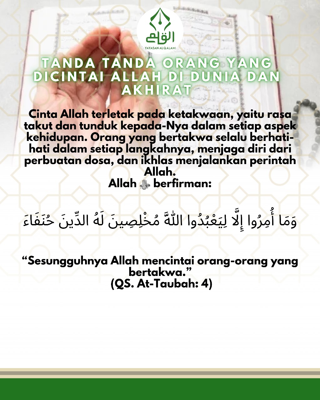 Al-Qur’an dan hadis Rasulullah ﷺ telah memberikan banyak petunjuk tentang ciri-ciri orang yang dicintai oleh Allah. Mari kita renungkan beberapa tanda penting yang menunjukkan kasih sayang dan perhatian Allah kepada hamba-hamba pilihan-Nya.